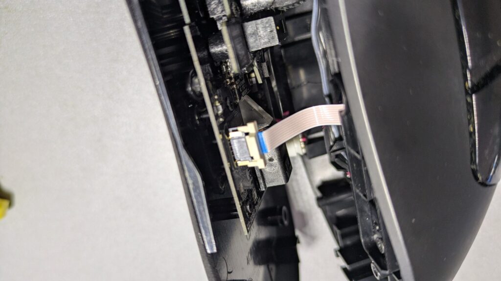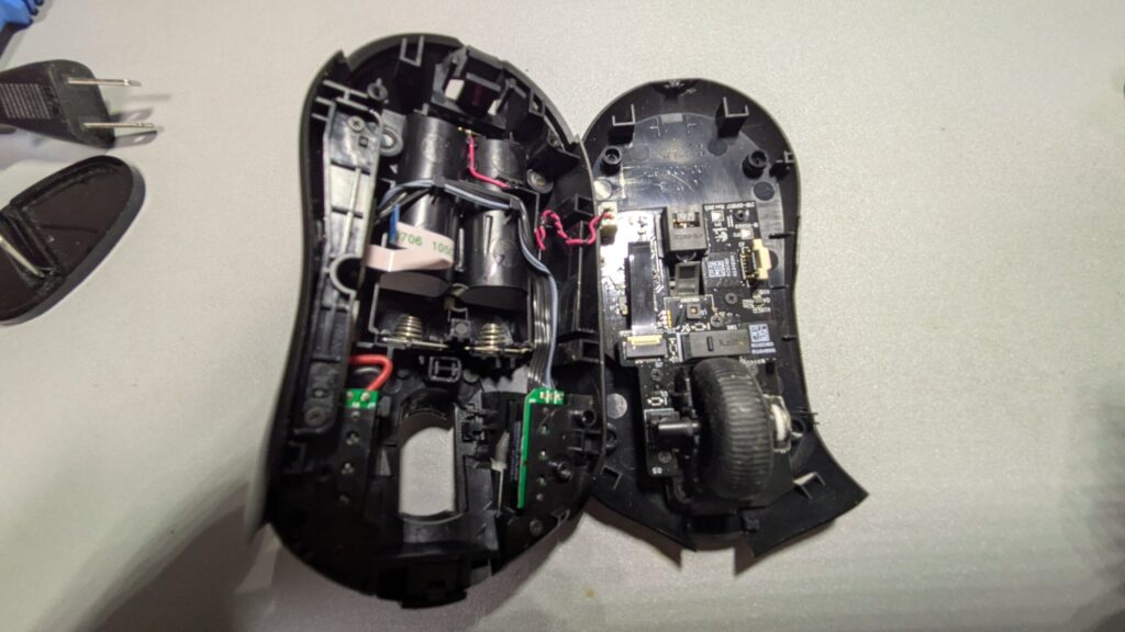 外すときはマウス後ろ側のつまみを持ち上げるようにすると外れますが、画像のようにフレキシブルケーブルがあるため、これを外さないと割れないようになってます。