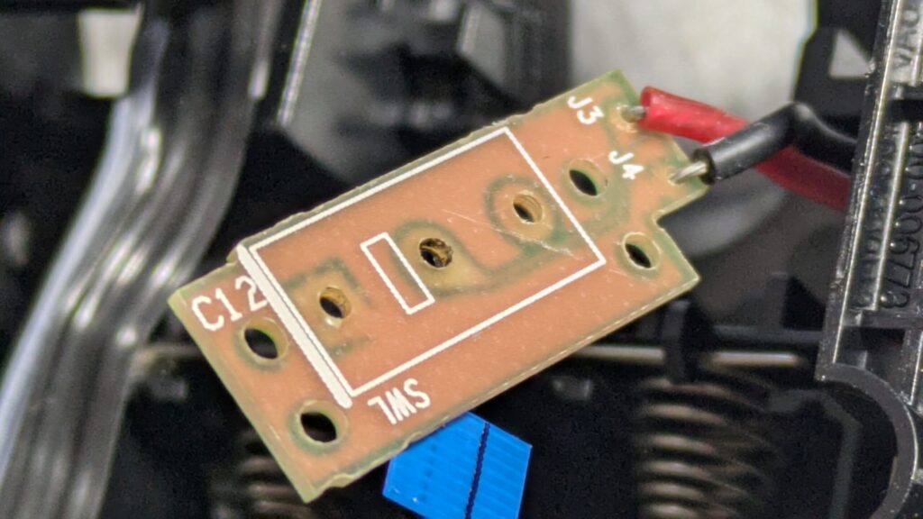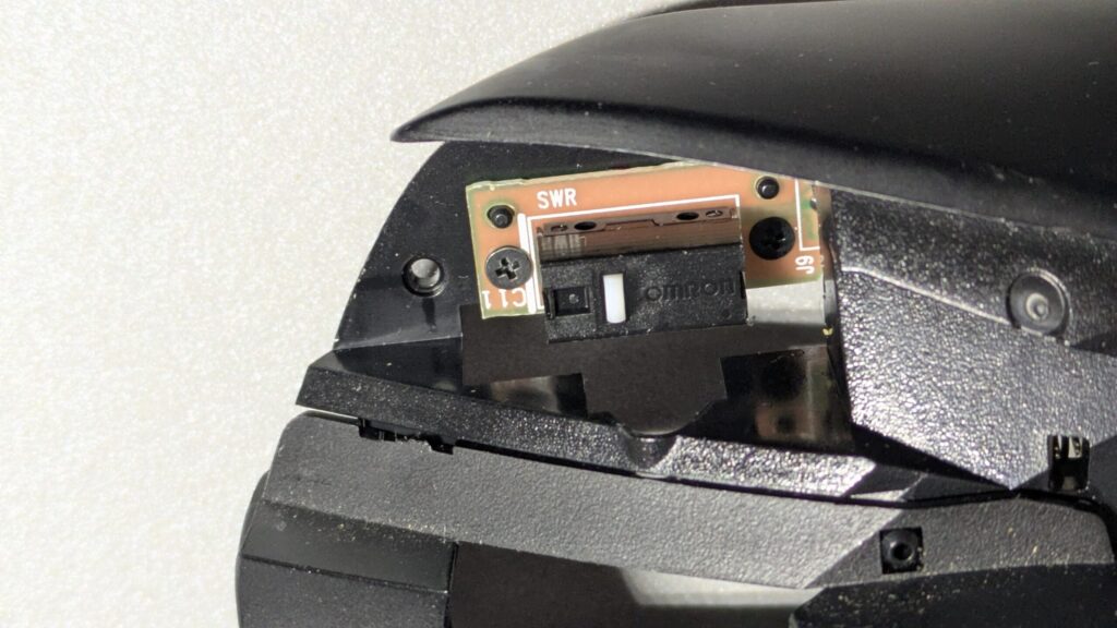 するとマイクロスイッチがついている基盤が現れますので、こちらに取り付けられている2つのネジも外します。