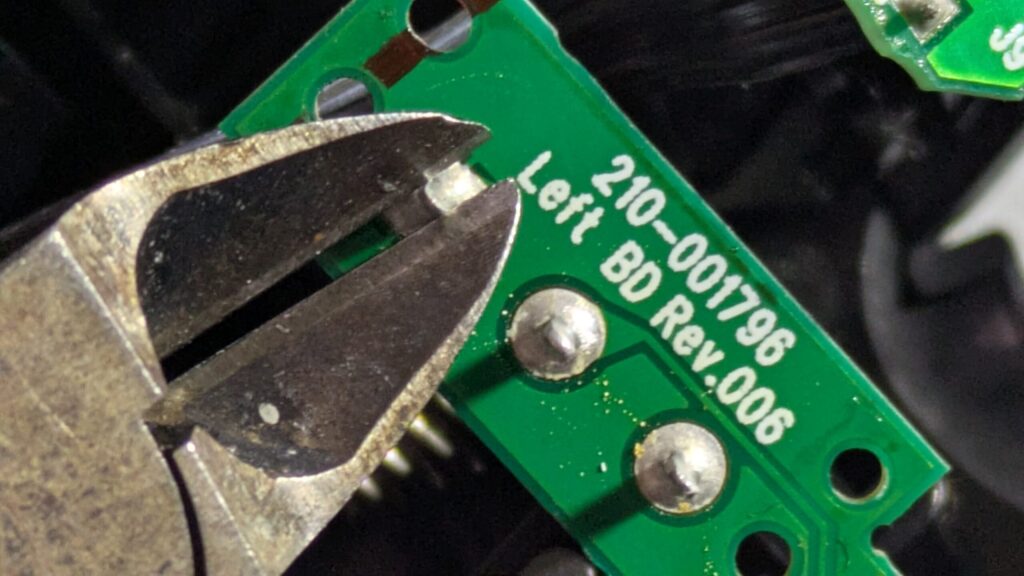 背面の基盤で、マイクロスイッチの足がでているため、これをニッパーで切り取ります。