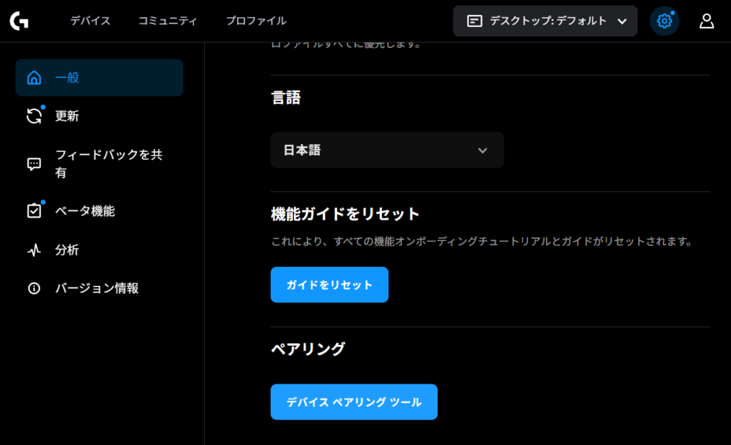 接続自体はとても簡単で、GHUBを起動して右上の歯車マークより「デバイスペアリングツール」よりペアリングすればいけた。